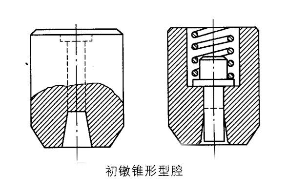 初鐓的形狀為錐形,初鐓錐形模腔有兩種形式,一為不帶彈簧頂桿(針),一為帶彈簧頂桿(針),如圖所示。
