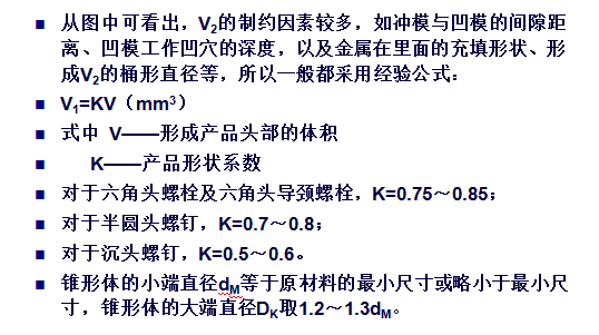 如圖可見(jiàn),整個(gè)錐形頭部的體積由體積V1和V2兩部分組成,即V錐=V1+V2,而V錐等于產(chǎn)品頭部精鐓后的體積即V。V可由產(chǎn)品尺寸計(jì)算出,則V1=V-V2。